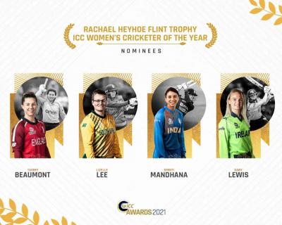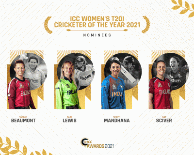 सर्वोत्तम महिला क्रिकेटपटूला दिल्या जाणाऱ्या Rachael Heyhoe Flint Trophy साठी इंग्लंडची टॅमी बीयूमोंट, दक्षइण आफ्रिकेची लिझली ली, भारताची स्मृती मानधना आणि आयर्लंडचा गॅबी लूईस या चौघी षर्यतीत आहेत. टॅमीनं २०२१मध्ये २१ आंतरराष्ट्रीय सामन्यात ४८.४४ सरासरीनं ८७२ धावा केल्या आहेत आणि त्यात १ शतक व ८ अर्धशतकांचा समावेश आहे. लिझली ली हिनं १९ आंतरराष्ट्रीय सामन्यांत ५७.६च्या सरासरीनं ८६४ धावा केल्या आहेत. त्यात १ शतक व ७ अर्धशतकांचा समावेश आहे. गॅबी लुईसनं १५ आंतरराष्ट्रीय सामन्यांत १ शतक व चार अर्धशतकांसह ५२च्या सरासरीनं ६२४ धावा केल्या आहेत. स्मृती मानधनानं २२ सामन्यांत ८५५ धावा केल्या आहेत. त्यात १ शतक व ५ अर्धशतकं आहेत.