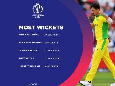 ऑस्ट्रेलियाच्या मिचेल स्टार्कने यंदाच्या वर्ल्ड कप स्पर्धेत सर्वाधित 27 विकेट घेण्याचा मान पटकावला आहे. एकाच स्पर्धेत सर्वाधिक विकेट घेण्याचा विक्रमही त्यानं नावावर केला. स्टार्कने 10 सामन्यांत 27 विकेट्स घेतल्या आहेत आणि न्यूझीलंडविरुद्ध त्यानं 5 बाद 26 धावांची सर्वोत्तम कामगिरी नोंदवली. त्यानं वेस्ट इंडिजविरुद्ध 46 धावांत 5 विकेट घेतल्या होत्या.
