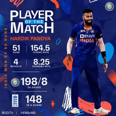 ड्वेन ब्राव्हो ( ६६* व ४-३८ वि. भारत, लॉर्ड्स २००९), मोहम्मद हाफिज ( ७१ व ४-१० वि. झिम्बाव्बे, हरारे २०११), शेन वॉटसन ( ५९ व ४-१५ वि. इंग्लंड, एडलेड २०११) व एस शिनवारी ६१ व ४-१४ वि. इंग्लंड, साउदहॅम्प्टन २०२२) यांनी ही कामगिरी केली आहे. तसेच इंग्लंडमध्ये दोनवेळा एकाच ट्वेंटी-२०त चार विकेट घेणाराही तो पहिलाच भारतीय ठरला. यापूर्वी २०१८मध्ये त्याने ३८ धावांत ४ विकेट्स घेतल्या होत्या.
