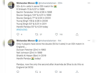 एकाच वन डे सामन्यात ५०+ धावा व ४ किंवा त्यापेक्षा जास्त विकेट घेणारा हार्दिक हा भारताचा पाचवा खेळाडू ठरला. यापूर्वी कृष्णमाचारी श्रीकांत ( वि. न्यूझीलंड, १९८८), सचिन तेंडुलकर ( वि. ऑस्ट्रेलिया, १९९८), सौरव गांगुली ( वि. श्रीलंका, १९९९ आणि वि. झिम्बाब्वे, २०००) व युवराज सिंग ( वि. इंग्लंड, २००८ आणि आयर्लंड, २०११) यांनी हा पराक्रम केला आहे.
