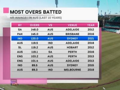 १९९२नंतर प्रथमच भारताच्या चार फलंदाजांनी कसोटीच्या चौथ्या डावात प्रत्येकी १००+ चेंडूंचा सामना केला. आजच्या सामन्यात चेतेश्वर पुजारा ( २०५ चेंडू), रिषभ पंत ( ११८), हनुमा विहारी ( १४९*) आणि आर अश्विन ( ११७*) यांनी ही कामगिरी केली. १९९२मध्ये दक्षिण आफ्रिकेविरुद्ध जोहान्सबर्ग कसोटीत रवी शास्त्री, अजय जडेजा, संजय मांजरेकर व प्रविण आमरे यांनी अशी कामगिरी केली होती.