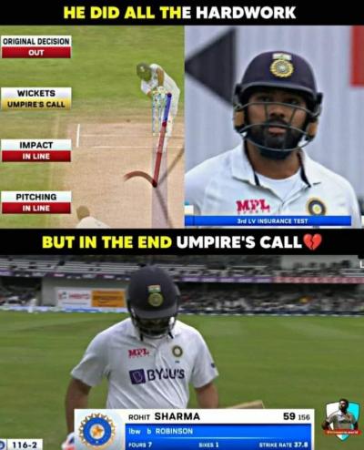 पायचीत असूनही त्याला मैदानावरील अम्पायरनं नाबाद दिलं अन् इंग्लंडचा कर्णधार जो रूट DRS घेण्यापासून हुकला. पण, अम्पायरनं दिलेल्या जीवदानाची सव्याज वसूली केली. ऑली रॉबिन्सनला अखेर रोहितची विकेट घेण्यात यश मिळालं, परंतु रोहित नाबाद होता अन् तरीही अम्पायरच्या चुकीमुळे त्याला माघारी जावं लागलं. ( Rohit Sharma is so unlucky, was looking so good but umpires call was against him )