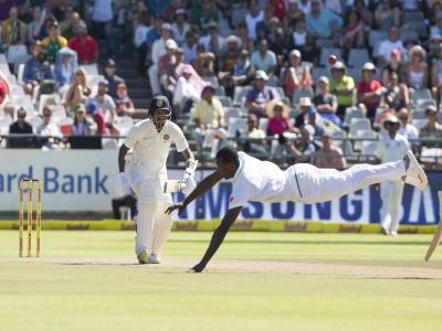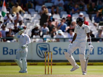 आफ्रिकन गोलंदाजांच्या भेदक माऱ्यापुढे भारताची आघाडीची फळी कोलमडली.सलामीवीर शिखर धवन, मुरली विजय आणि कर्णधार विराट कोहली यांच्यानंतर आता रोहित शर्मा आणि पुजार देखील बाद झाले.