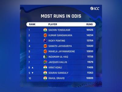 कोहलीनं वन डे क्रिकेटमध्ये सर्वाधिक धावा करणाऱ्या फलंदाजांमध्ये आठवे स्थान पटकावले आहे. त्यानं 11406 धावांसह भारताचा माजी कर्णार सौरव गांगुली ( 11363) चा विक्रम मोडला. भारतीय फलंदाजांमध्ये तेंडुलकरनंतर कोहली दुसऱ्या क्रमांकावर आहे.