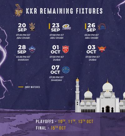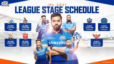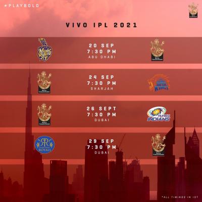 IPL 2021 schedule : MI, CSK, SRH, KKR, PBKS, RCB, RR, DC schedule in one click इंडियन प्रीमिअर लीगच्या ( The 2021 Indian Premier League) 14व्या पर्वातील उर्वरित सामन्यांचे वेळापत्रक बीसीसीआयनं रविवारी जाहीर केले. संयुक्त अरब अमिराती येथे 19 सप्टेंबर ते 15 ऑक्टोबर या कालावधीत उर्वरित 31 सामने खेळवण्यात येणार आहेत. गतविजेता मुंबई इंडियन्स आणि माजी विजेता चेन्नई सुपर किंग्स यांच्यात 19 सप्टेंबरला सामना रंगणार असल्याचे वृत्त समोर आले आहे आणि हा सामना दुबईत खेळवण्यात येणार आहे. आयपीएलच्या सामने दुपारी 3.30 आणि सायंकाळी 7.30 वाजता खेळवण्यात येतील.