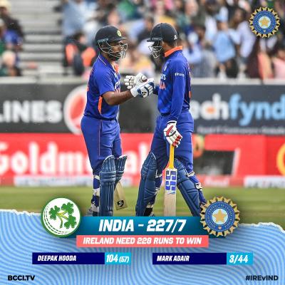 दीपकची १०४ धावांची खेळी ही आयर्लंडविरुद्ध भारतीय फलंदाजाची सर्वोत्तम वैयक्तिक खेळी ठरली. सूर्यकुमार यादव ( १५) दिनेश कार्तिक ( ०), अक्षर पटेल ( ०) व हर्षल पटेल ( ०) हे झटपट बाद झाले. भारताने ७ बाद २२७ धावा केल्या. रोहित शर्मा (४), लोकेश राहुल ( २), सुरेश रैना ( १) यांनी ट्वेंटी-२०त शतक झळकावले आहेत.