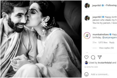त्यानं संजनाला वाढदिवसाच्या शुभेच्छा देताना फोटो पोस्ट केला. त्यात संजना त्याच्या गालावर Kiss करताना दिसत आहे. त्यावर बुमराहनं लिहिलं की, माझं हृदय रोज जिंकणाऱ्या त्या व्यक्तीला वाढदिवसाच्या शुभेच्छा. तु माझी आहेस, आय लव्ह यू!