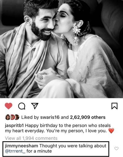 बुमराहने २०१६ ला आंतरराष्ट्रीय क्रिकेटमध्ये पदार्पण केले. आतापर्यंत तो १९ कसोटी, ६७ वन डे आणि ४९ टी-२० आंतरराष्ट्रीय सामने खेळला आहे. बुमराहच्या पोस्टनंतर मुंबई इंडियन्सचा सदस्य जिमी निशॅम यानं ट्रोल केलं. थोड्यावेळासाठी मला असं वाटलं की तू ट्रेंट बोल्टबद्दल बोलत आहेस.
