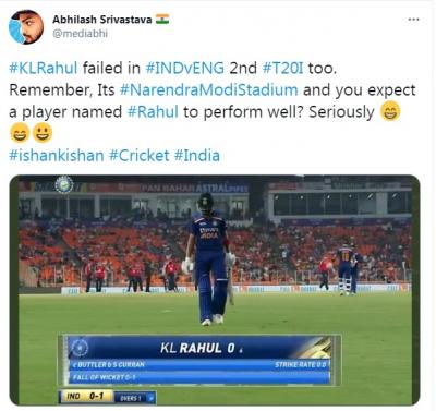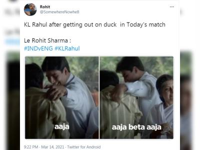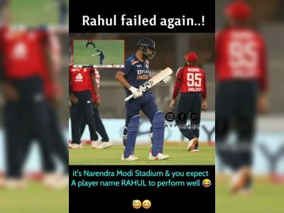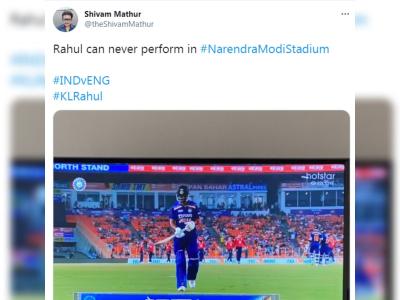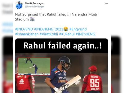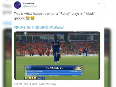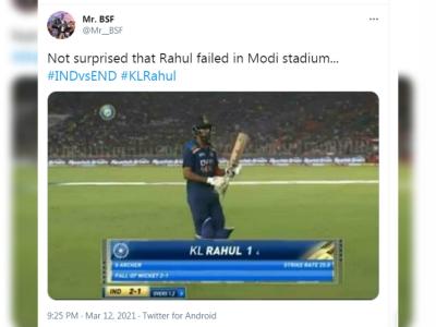 India vs England 2nd T20I : भारत-इंग्लंड यांच्यातल्या दुसऱ्या ट्वेंटी-२० सामन्यातही लोकेश राहुलला ( KL Rahul) अपयश आलं. पहिल्याच षटकात तो भोपळा न फोडताच माघारी परतला. पहिल्या सामन्यातही तो १ धाव करून बाद झाला होता. या दोन्ही सामन्यात कर्णधार विराट कोहलीनं ( Virat Kohli) राहुलसोबतचा सलामीचा जोडीदार बदलला, परंतु त्यानं फार फरक पडला नाही. पण, राहुलच्या अपयशानं सोशल मीडियावर मीम्सचा मात्र धुरळा उडला आहे. नरेंद्र मोदी स्टेडियमवर राहुलकडून चांगल्या कामगिरीची अपेक्षा कशी करू शकता, असा सवाल नेटिझन्स विचारत आहेत.