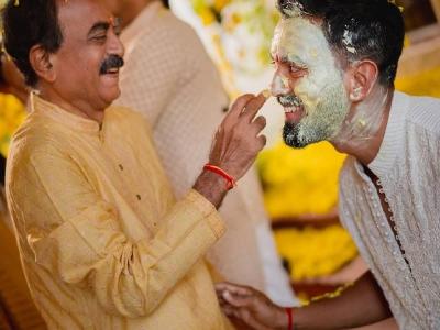 राहुलने 'सुख' अशा आशयाचे ट्विट करत हळदी समारंभाचे फोटो शेअर केले आहेत. या फोटोंमध्ये नवदाम्पत्यांने रोमॅंटिक पोज दिल्या आहेत.