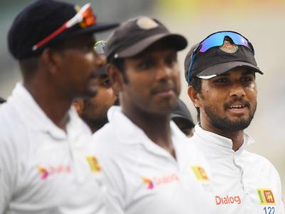 पहिल्या दिवसाच्या खेळादरम्यान दिनेश चंडिमल आणि इतर श्रीलंकन खेळाडू