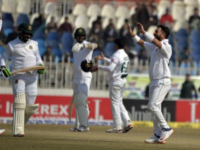 बांगलादेशचा पहिला डाव 233 धावांवर गुंडाळला. शाहीन आफ्रिदीनं सर्वाधिक चार विकेट्स घेतल्या. त्याला मोहम्मद अब्बास आणि हॅरीस सोहेल यांनी प्रत्येकी दोन विकेट्स घेत चांगली साथ दिली.