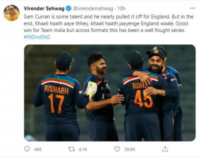 इंग्लंडविरुद्धच्या तीन एकदिवसीय सामान्यांच्या मालिकेत भारताने अंतिम सामन्यात विजय मिळवता मालिका जिंकली. त्यानंतर, टीम इंडियाचे सर्वत्र कौतुक होत असून इंग्लडच्या सॅम करणच्या खेळीचंही अनेकांनी कौतुक केलंय. विरेंदर सेहवागनेही सॅमचं कौतुक केलं असून इंग्लंड संघाला टोला लगावला.