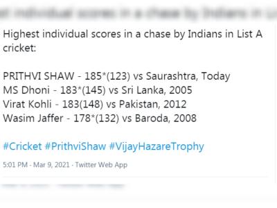 विजय हजारे ट्रॉफीत सर्वोत्तम वैयक्तिक खेळीचा विक्रमही पृथ्वीच्या नावावर आहे. त्यानं या मोसमात पुद्दुचेरीविरुद्ध नाबाद २२७ धावा चोपल्या होत्या. त्यानंतर संजू सॅमसन २१२*, यशस्वी जैस्वाल २०३, कर्ण कौशल २०२, वेंकटेश अय्यर १९८, रविकुमार समर्थ १९२, अजिंक्य रहाणे १८७ आणि पृथ्वी शॉ १८५* असा क्रमांक येतो.
