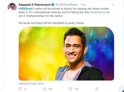 तमिळनाडूचे मुख्यमंत्री इडापड्डी पलानीसामी यांनीही धोनीला शुभेच्छा दिल्या आहेत, तसेच भारतीय क्रिकेटचा नेता म्हणून तू इतिहास रचल्याचंही ते म्हणाले.