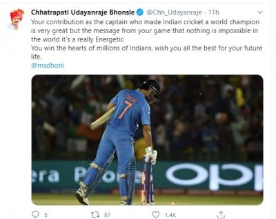 खासदार उदयनराजे भोसले यांनीही धोनीला शुभेच्छा दिल्या असून धोनीच्या खेळीने लक्षावधी लोकांची मनं जिंकल्याच त्यांनी म्हटलंय