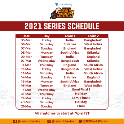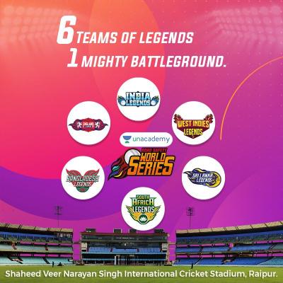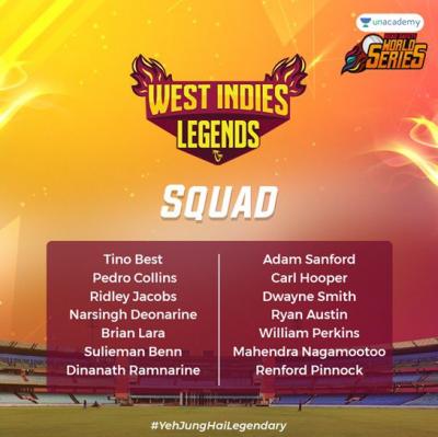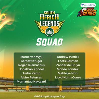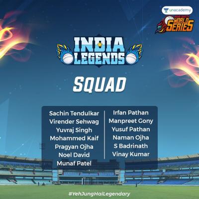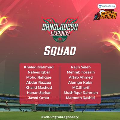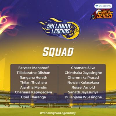 श्रीलंका संघ Sri Lanka Legends - तिलकरत्ने दिलशान ( कर्णधार), उपुल थरंगा, चमारा सिल्वा. चिंथका जयासिंघे, थिलान तुषारा, नुवान कुलसेकरा, रसेल अर्नोल्ड, अजंथा मेंडीस, फरवीज महरूफ, सनथ जयसूर्या, मंजुला प्रसाद, मलिंदा वर्नापुरा, धम्मिका प्रसाद, रंगना हेराथ, चमारा कपुगेदरा, धुलांदना विजेसिंघे