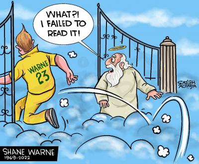 कार्टुनिस्ट सतिश आचार्य यांनी कार्टुन चित्र रेखाटक शेन वॉर्नला श्रद्धांजली वाहिली आहे. तसेच, मी हे वाचण्यास समर्थ नसल्याचंही त्यांनी म्हटलंय.