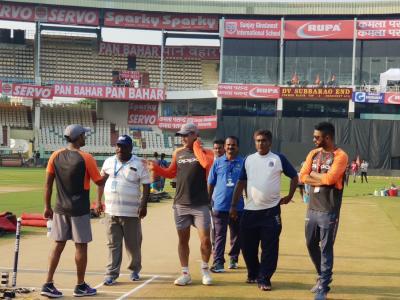 भारतीय क्रिकेट संघाचा माजी कर्णधार महेंद्रसिंग धोनीने विशाखापट्टणम स्टेडियमवर पोहचल्यावर खेळपट्टीचा पोत बघितला. त्याने या मैदानाशी जोडलेल्या आठवणींनाही उजाळा दिला.