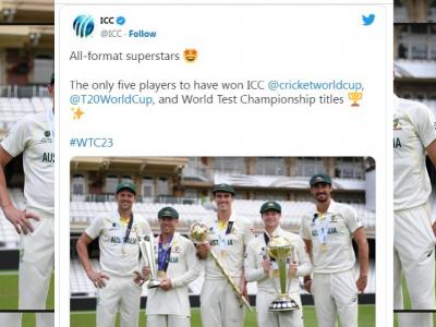 आयसीसीच्या सर्व सहा स्पर्धा जिंकणारा तो पहिला संघ ठरला. शिवाय आयसीसीच्या सर्व सिनियर स्थराच्या स्पर्धा जिंकणारा ऑस्ट्रेलिया हा पहिला देश आहे. पण, याच संघातील पाच खेळाडूंनीही मोठ्या विक्रमाला गवसणी घातली आहे. स्टीव्ह स्मिथ, डेव्हिड वॉर्नर, पॅट कमिन्स, मिचेल स्टार्क व जोश हेझलवूड हे आयसीसीच्या वन डे, ट्वेंटी-२० वर्ल्ड कप आणि जागतिक कसोटी जिंकणारे खेळाडू ठरले आहेत.