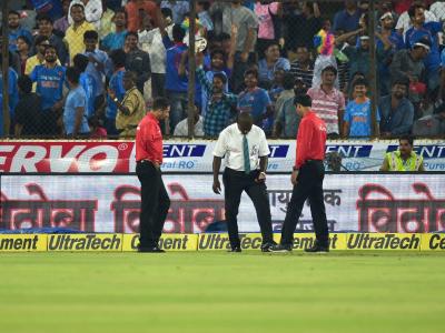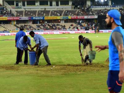 मात्र, पावसामुळे मैदान खेळण्यायोग्य नव्हते. मैदानाचा हा भाग सुकवण्यासाठी काही कर्माचाऱ्यांनी अक्षरश: मैदानात टेबल फॅन आणून लावले.