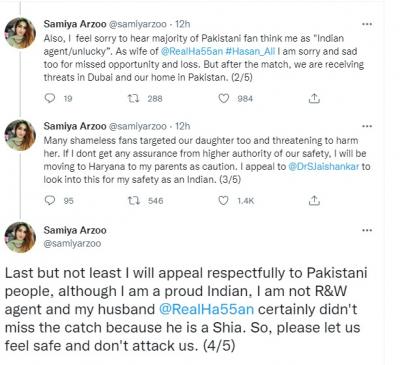 ''अनेक पाकिस्तानी चाहत्यांना असं वाटतं की मी भारतीय एजंट/पनवती आहे, त्याचे मला खूप वाईट वाटते. पाकिस्तानी संघानं संधी गमावली, हार पत्करली याचे हसन अलीची पत्नी म्हणून मलाही वाईट वाटतं. पण, सामन्यानंतर आम्हाला जीवेमारण्याच्या धमक्या मिळू लागल्या,''असंही तिनं लिहिलं.