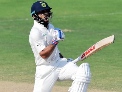 विराट कोहली (156) धावांवर नाबाद आहे, सलग तीन शतके झळकावण्याची हॅटट्रीक करणारा ठरला पहिला कर्णधार.
