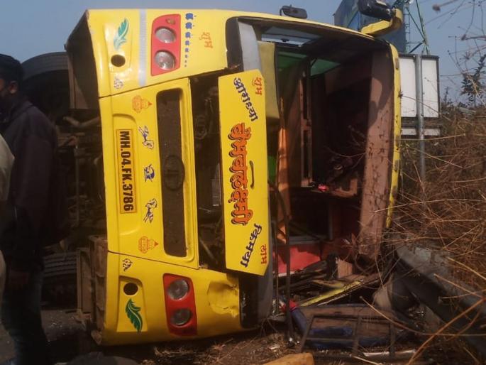 किवळे : मुंबई-पुणे द्रुतगती मार्गाने शहापूरहून सांगलीला निघालेली प्रवासी बस वळणाचा अंदाज न आल्याने किवळे उड्डाणपूलावर रविवारी दुपारी १२ च्या सुमारास पलटली. या अपघातात साखरपूड्याला चाललेले ४० पैकी २५ प्रवासी जखमी झाले असून तिघांची प्रकृती चिंताजनक असल्याचे समजते. मुंबई-पुणे द्रुतगती महामार्गाने ४० प्रवासी घेऊन जाणारी भरधाव खाजगी बस किवळे पूलावर रस्त्याच्या कडेला पलटली. चालकाचा बसवरील ताबा सुटल्याने बस उलटली. बसमधील प्रवासी गंभीर जखमी झाले आहेत. या अपघातात २५ जण जखमी झाले आहेत. सर्व जखमींना निगडी व चिंचवड येथील खाजगी रुग्णालयात तातडीने दाखल करण्यात आले आहे. अपघातानंतर बसचा चालक घटनास्थळावरून फरार झाला आहे.