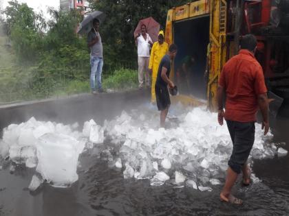Video : बर्फ घेऊन जाणाऱ्या ट्रकचा तुर्भे उड्डाणपुलावर अपघात