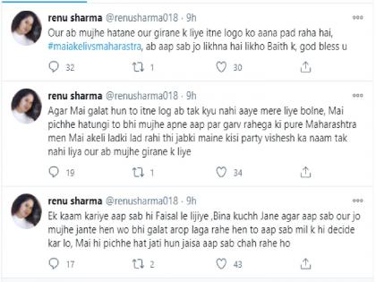 तक्रारदार महिलेने ट्विटमध्ये म्हटलं की, एक काम करा, तुम्ही सगळ्यांनी निर्णय घ्या, काहीही माहिती नसताना जे मला ओळखत नाहीत आणि जे ओळखतात ते चुकीचा आरोप करत आहेत. तुम्ही सगळ्यांनी मिळून ठरवा, मी माघार घेते जी तुमची इच्छा आहे. जर मी चुकीची होती तर हे लोक आतापर्यंत पुढे का आले नाहीत? मी मागे हटली तरी मला माझ्यावर गर्व आहे. संपूर्ण महाराष्ट्रात मी एकटीच अशी मुलगी आहे जी लढतेय. मी कोणत्याही पक्षाचं नाव घेतलं नाही आणि हे लोक माझ्याविरोधात एकत्र आलेत, तुम्हाला जे हवं ते लिहा असं सांगत रेणु शर्माने देव तुमचं भलं करो असं ट्विटमध्ये लिहिलं आहे.