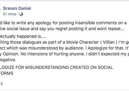 वादाचा विषय झाल्यानंतर डॅनिअलने हे पोस्ट डिलीट केले आहेत. मात्र, त्याच्या पोस्टचे स्क्रीनशॉट व्हायरल होऊ लागले आहेत. यानंतर डॅनिअलने हे डायलॉग मी एका सिनेमाच्या खलनायकासाठी लिहीत होतो. मात्र, लोकांनी त्यातून चुकीचा अर्थ घेतला. यासाठी मी माफी मागतो. हे माझे विचार नाहीत. कोणाला दुखविण्याचा विचार नव्हता, अशी सारवासारव केली आहे.