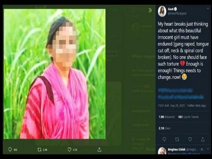 इंडिया टुडेच्या अँटी फेक न्यूज वॉर रूममध्ये (एएफडब्ल्यूए) असे आढळले की, ज्या मुलीचा फोटो सोशल मीडियावर हाथरस सामूहिक बलात्कार पीडित मुलीच्या नावावर शेअर केला जात आहे, तो खरतर दुसऱ्या मुलीचा फोटो आहे. हा दावा ट्विटरवर खूप व्हायरल झाला आहे. सामूहिक बलात्कार पीडित नावाच्या हॅशटॅगसह हा फोटो शेअर केला आहे. त्यात लिहिले की, "या निरागस, सुंदर मुलीवर सामूहिक बलात्कार करण्यात आला या विचाराने माझे हृदय कंपित झाले. गँगरेप झाला, जीभ कापली गेली, मान आणि पाठीचा कणा तोडला गेला ... इतका अत्याचार कोणालाही सहन करावा लागत नाही! तथापि, प्रत्येक गोष्टीची एक मर्यादा असते. बदल येणं आवश्यक आहे. आता ही बातमी लिहिली गेल्यानंतर जवळपास १९०० लोकांनी ही पोस्ट शेअर केली होती. पोस्टचा फोटो आपण खाली पाहू शकता.