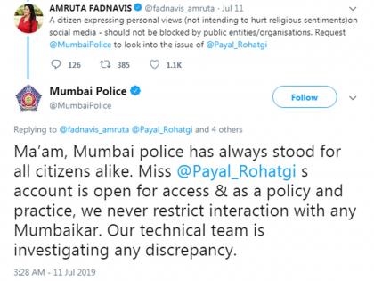 Ma’am, Mumbai police has always stood for all citizens alike. Miss @Payal_Rohatgi s account is open for access & as a policy and practice, we never restrict interaction with any Mumbaikar. Our technical team is investigating any discrepancy.