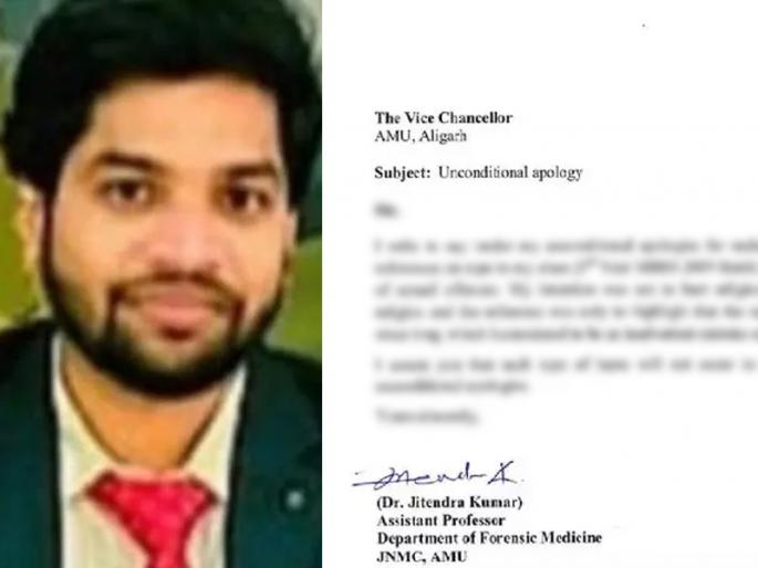 अलिगड मुस्लिम विद्यापीठाचे सहाय्यक प्राध्यापक डॉ. जितेंद्र कुमार यांना हिंदू देव-देवतांबाबत आक्षेपार्ह टिप्पणी करणं महागात पडलं आहे. याप्रकरणी एएमयूने प्राध्यापकाला निलंबित केले आहे. मात्र, प्राध्यापकाने लेखी माफी मागितली होती. डॉ. जितेंद्र यांच्याशी संबंधित वादग्रस्त पॉवर पॉइंट प्रेझेंटेशन प्रकरणात भादंवि कलम १५३-अ, २९५ -अ, २९८ आणि ५०५ अन्व्ये एफआयआर नोंदवण्यात आला आहे.त्याचवेळी आरोपी असिस्टंट प्रोफेसर डॉ. जितेंद्र यांनी माफीनाम्यात लिहिले आहे की, त्यांच्या शिकवणीचा उद्देश धार्मिक भावना दुखावण्याचा नव्हता तर बलात्कार हा समाजाचा एक भाग असल्याचे स्पष्ट करणे हा होता. याप्रकरणी वाद वाढल्यानंतर बुधवारी एएमयूने सहाय्यक प्राध्यापकास कारणे दाखवा नोटीस बजावली होती.वास्तविक, असिस्टंट प्रोफेसर डॉ जितेंद्र कुमार यांनी लेक्चर दरम्यान प्रोजेक्टरवर दाखवलेल्या पॉईंट्समध्ये आक्षेपार्ह गोष्टी लिहून एका धर्माच्या भावना दुखावल्या, ज्यानंतर त्यांचा फोटो सोशल मीडियावर व्हायरल झाला. AMU प्रशासनाने सहाय्यक प्राध्यापक डॉ. जितेंद्र कुमार यांना कारणे दाखवा नोटीस बजावली होती आणि २४ तासांत उत्तर मागितले होते. एएमयू प्रॉक्टरने या वादावर ही माहिती दिली AMU प्रॉक्टर डॉ वसीम अली यांनी सांगितले की, व्याख्यानादरम्यान, फॉरेन्सिक मेडिसिन विभागाचे सहाय्यक प्राध्यापक डॉ जितेंद्र यांनी वर्गातील विद्यार्थ्यांच्या निदर्शनास काही आक्षेपार्ह-धार्मिक भावना दुखावल्या होत्या, ज्याचा फोटो व्हायरल झाला होता. एएमयूचे कुलगुरू तारिक मन्सूर यांनी स्वत: या प्रकरणाचे गांभीर्य दाखवले असून लवकरच याप्रकरणी कारवाई केली जाईल, असे सांगितले. भाजप नेत्याने प्राध्यापकाविरोधात तक्रार दिलीएएमयूचे माजी विद्यार्थी आणि भाजप नेते डॉ निशांत शर्मा म्हणाले की, मेडिकल कॉलेजच्या फॉरेन्सिक मेडिसिन विभागाचे सहाय्यक प्राध्यापक डॉ. जितेंद्र यांनी बलात्काराच्या घटनेबद्दल शिकवताना हिंदू देवतांबाबत आक्षेपार्ह असे वर्गाला शिकवले आहे. याप्रकरणी हा फोटो सोशल मीडियावर व्हायरल झाल्यानंतर विभागाच्या अध्यक्षांसह सहाय्यक प्राध्यापकाविरुद्ध सिव्हिल लाइन्स पोलिस ठाण्यात तक्रार दाखल करण्यात आली आहे. डॉ निशांत शर्मा यांच्या मते, 'अध्यक्षांच्या माहितीशिवाय असिस्टंट प्रोफेसरने हे सर्व शिकवले नाही. अध्यक्षांनाही याची माहिती असेल. अध्यक्ष व सहाय्यक प्राध्यापकावर गंभीर कारवाई होणे गरजेचे आहे. हे लोक हिंदू देवतांचा अपमान करत आहेत.