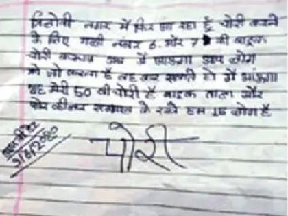 चोराच्या उलट्या बोंबा अशा होत्या की, त्याने चोरीच्या अगोदर खुले आव्हानस्वरूपात पत्र स्थानिक रहिवासी आणि पोलिसांसाठी परिसरात फेकले आणि त्यासोबत दोन बांगड्याही ठेवल्या होत्या. पत्रात चोरट्याने असे सांगितले आहे की, येत्या काळात तो या भागात चोरी करणार आहे तसेच ते 15 लोक आहेत आणि ही त्यांची 50 वी चोरी असेल आणि रहिवाशांना धमकी देताना इशारा दिला आहे की, त्याने आपली दुचाकी,चारचाकी वाहन सांभाळून ठेवा, कारण आम्ही लवकरच येत आहोत. हे पत्र मिळाल्यानंतर आणि ते वाचल्यानंतर सर्व रहिवासी घाबरले आहेत.
