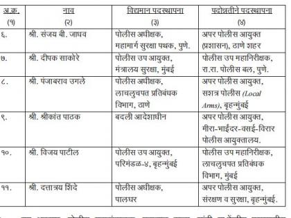 संदीप कर्णिक पुण्याचे नवे सह पोलीस आयुक्तपदी आले आहेत. मुंबई गुन्हे शाखेचे सह पोलीस आयुक्त मिलिंद भारंबे यांच्याजागी सुहास वारके आले आहेत. उस्मानाबादच्या जिल्हा पोलीस अधीक्षक नीवा जेन यांच्या जागी अक्षय शिंदे यांची बदली झाली आहे.