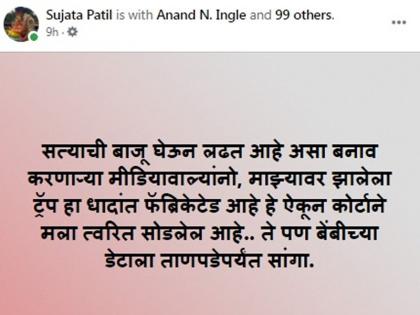 जामिनावर सुटल्यानंतर सुजाता पाटील यांनी फेसबुकवर पोस्ट करून संताप व्यक्त केला आहे. या पोस्टमध्ये त्यांनी सत्याची बाजू घेऊन लढत आहे असा बनाव करणाऱ्या मीडियावाल्यांनो, माझ्यावर झालेला ट्रॅप हा धादांत फॅब्रिकेटेड आहे. हे ऐकून कोर्टाने मला त्वरित सोडलेले आहे. ते पण बेंबीच्या डेटाला ताण पडेपर्यंत सांगा. अशा संतप्त भावना व्यक्त केल्या आहेत.