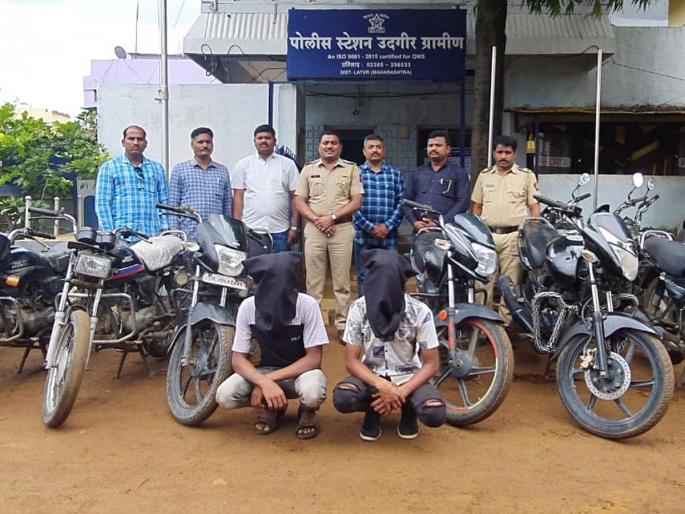 लातूर : महाराष्ट्र-कर्नाटक सीमाभागातील गावातून मोटारसायकल चोरून, त्याची परस्पर विल्हेवाट लावणाऱ्या दोघा चोरट्यांच्या मुसक्या उदगीर ग्रामीण ठाण्याच्या पथकाने गुरुवारी आवळल्या आहेत. त्यांच्याकडून ७ मोटरसायकलींसह ३ लाख ७८ हजारांचा मुद्देमाल जप्त करण्यात आला आहे.