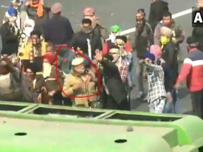 Farmers Tractor Rally : व्हिडिओत पोलीस जवान हिंसक शेतकऱ्यांच्या जमावात सापडतो, मात्र एक वृद्ध शेतकरी त्या पोलिसाला सुरक्षितपणे जमावातून बाहेर काढतो.