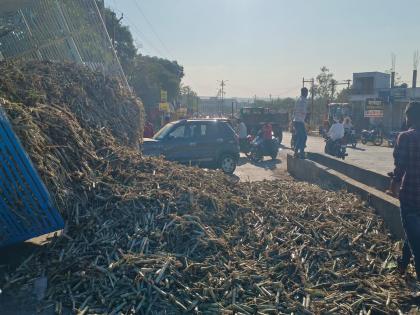 सुदैवाने जीवितहानी टळली, रस्त्यावर सांडलेला ऊस बनला जनावरांचा चारा; अपघाताच्या ठिकाणी पशुपालकांची गर्दी. ...