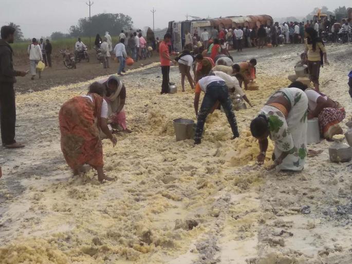दरम्यान, अपघातामुळेमहामार्गावर पडलेले तेल हे कच्चे तेल आहे़ त्यावर प्रक्रिया न झाल्याने ते खाण्यास योग्य नसल्याची चर्चा रंगली होती़ घटनास्थळावर नागरिक तेल नेत असताना पोलिसांसह इतर कोणीही त्यांना अटकाव करण्याचा प्रयत्न केला नाही, हे विशेष़ अपघातामुळे काही काळ वाहतुकीची कोंडी झाली होती़ त्यानंतर तेल सांडलेल्या मार्गाजवळ सुरू असलेल्या रस्ता कामातील सर्व्हिस रोडवरून वाहतूक सुरळीत करण्यात आली़ या घटनेची नळदुर्ग पोलीस ठाण्यात रात्री उशिरापर्यंत नोंद झाली नव्हती.