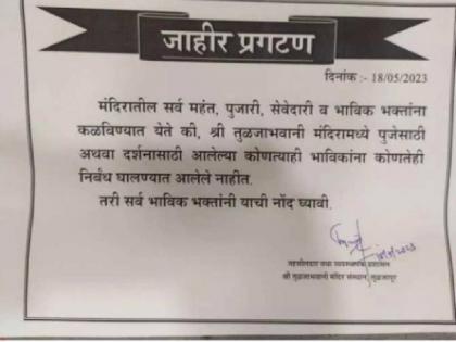 तुळजाभवानी मंदिरात दर्शनासाठी येताना भक्तांनी कशा प्रकारचे कपडे घालावेत याबाबत मार्गदर्शन करणारे सूचनापलक मंदिर परिसरात लावण्यात आले होते. अंगप्रदर्शक, उत्तेजक, असभ्य व अशोभनीय वस्त्रधारी, तसेच हाफ पँट, बर्मुडाधारींना मंदिरात प्रवेश नाही. कृपया भारतीय संस्कृती आणि सभ्यतेचे भान ठेवा, असा मजकूर या फलकावर लिहिण्यात आला होता.