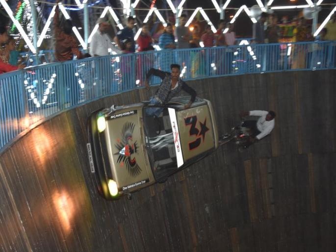 धुळे : शहरातील एकवीरादेवी यात्रोत्सवात लाकडी फळ्यांनी तयार केलेले उंच गोलाकार वर्तुळात चाळीसगावचे दोन व्यावसायिक त्यांचा जीव धोक्यात घालून यात्रेत पैसे कमविण्यासाठी ‘मौत का कुवा’ या प्रकारात चित्तथरारक कसरती सादर करीत भाविकांचे लक्ष वेधून घेत आहेत. गोलाकार वर्तुळात ते दोन्ही सुसाट वेगाने चारचाकी व दुचाकी गाड्या चालवून भाविकांचे मनोरंजन करत आहे. त्यांच्या या कसरतींना भाविकांकडून उत्स्फूर्त दाद मिळत आहे.