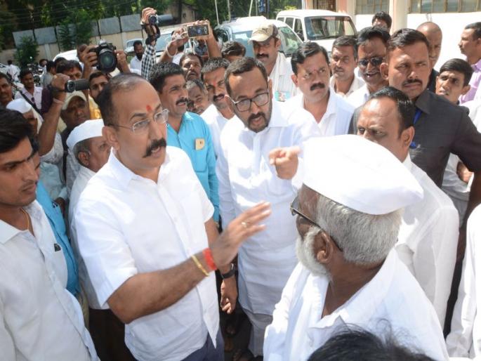 धुळे : जिल्हाधिकारी कार्यालयातील नियोजन भवनात बुधवारी आयोजित कर्जमाफीचे प्रमाणपत्र वाटप कार्यक्रमासाठी ४० शेतकºयांना निमंत्रित करण्यात आले होते. मात्र, प्रत्यक्षात केवळ २० शेतकºयांना कर्जमाफीचे प्रमाणपत्र वितरीत झाले. परिणामी, संतप्त शेतकºयांनी जिल्हाधिकारी कार्यालयात कॉँग्रेसच्या पदाधिकाºयांसोबत शासनाच्या विरोधात घोषणाबाजी केली. यावेळी संतप्त शेतकºयांना समज देण्यासाठी भाजपाचे पदाधिकारी गेले असता कॉँग्रेस व भाजपाच्या पदाधिकाºयांमध्ये जोरदार शाब्दीक चकमक झाली. पुढे संतप्त शेतकºयांनी पालकमंत्री दादा भुसे व जिल्हा उपनिबंधक जे. के. ठाकूर यांनाही घेराव घालत जाब विचारला.