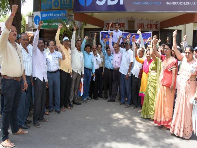 लोकमत न्यूज नेटवर्कधुळे : गेल्या आठ महिन्यांपूर्वी वेतन कराराची मुदत संपूनही नव्या वेतन करारासाठी टाळाटाळ करणाºया केंद्र सरकारचा निषेध करत संपावर गेलेल्या बॅँक अधिकारी व कर्मचा-यांनी बुधवारी सकाळी शहरात स्टेट बॅँक मुख्यालयासमोर जोरदार निदर्शने केली. यातूनही मार्ग न निघाल्यास बेमुदत संपाचा इशारा यावेळी देण्यात आला. युनायटेड फोरम आॅफ बॅँक्स युनियनतर्फे अधिकारी, कर्मचा-यांच्या प्रलंबित वेतन कराराच्या मागणीसाठी ३० व ३१ रोजी संप पुकारण्यात आला आहे. पहिल्या दिवशी सकाळी युनायटेड फोरम आॅफ बॅँक्स युनियनच्या पदाधिका-यांसह अधिकारी व कर्मचा-यांनी स्टेट बॅँकेच्या येथील मुख्यालयासमोर जमून जोरदार घोषणा देत निदर्शने केली. यावेळी युनियनचे अध्यक्ष संजय गिरासे, उपाध्यक्ष राजेंद्र चव्हाण, सुहास खाडिलकर, हेमंत कुलकर्णी, नरेंद्र वडनेरे, लक्ष्मीकांत जोशी, प्रमोद वेल्हणकर, कैलास दलाल, शिवाजी भामरे, सचिन येवले, प्रदीप पाटील, आनंदा सोनवणे, मोहन महाले, मिलिंद मेश्रामकर यांच्यासह बहुसंख्य स्त्री-पुरूष अधिकारी, कर्मचारी उपस्थित होते. ज्या-ज्या वेळी सरकार आर्थिक अडचणीत येते त्या-त्यावेळी बॅँका सरकारच्या मदतीला धावतात. नोटाबंदीचा निर्णयसुद्धा सरकारचा होता. त्यावेळीही प्रत्येक कर्मचारी, अधिका-याने रात्रीचा दिवस करून खूप मेहनत घेतली. त्या आधारेच वेतनवाढ अपेक्षित होती. मात्र तसे न होता थट्टा केली जात आहे. नोटबंदीच्या काळात काही बॅँकांची कर्जे वेळेवर वसूल होऊ शकले नाही. त्यामुळे त्या अडचणीत आल्या.मात्र त्याचे खापर कर्मचा-यांवर फोडले जाऊन वेतनवाढ देणे अशक्य असल्याचे सांगण्यात येत आहे. त्याच्या निषेधार्थ व न्याय्य मागणीसाठी कर्मचारी संपावर जात आहेत. बेमुदत संपाचीही तयारीही संघटनांनी केली आहे. ह ग्राहकांना वेठीस धरण्याचा प्रकार नसून त्यांनीही आम्हास सहकार्य करावे, असे आवाहन संघटनेच्या वतीने यावेळी करण्यात आले. जिल्ह्यात या संपामुळे जिल्ह्यात दिवसभरात होणारी सुमारे ५०० कोटींची उलाढाल ठप्प झाली. बॅँक कार्यालयांमध्ये शुकशुकाट पसरला होता. सर्व कर्मचारी, अधिकारी निदर्शनांसाठी स्टेट बॅँक मुख्यालयासमोर एकवटले होते. यावेळी युनायटेड फोरम आॅफ बॅँक्स युनियनचे अध्यक्ष संजय गिरासे व अन्य पदाधिका-यांनी मार्गदर्शन केले. कर्मचारी, अधिका-यांसाठी दर पाच वर्षांनी होणारा वेतन करार गतवर्षी आॅक्टोबर महिन्यात संपला. त्यामुळे नोव्हेंबरपासून नवीन वेतन करारानुसार वेतन मिळायला हवे होते. सरकारने तसे आश्वासनही दिले होते. परंतु तसे घडलेले नाही. त्यासाठीच्या चर्चा, बैठकाही निष्फळ ठरल्या. केवळ दोन टक्के वेतनवाढ देण्याची तयारी दर्शविली. पण दोन टक्के वेतनवाढ म्हणजे कर्मचारी, अ