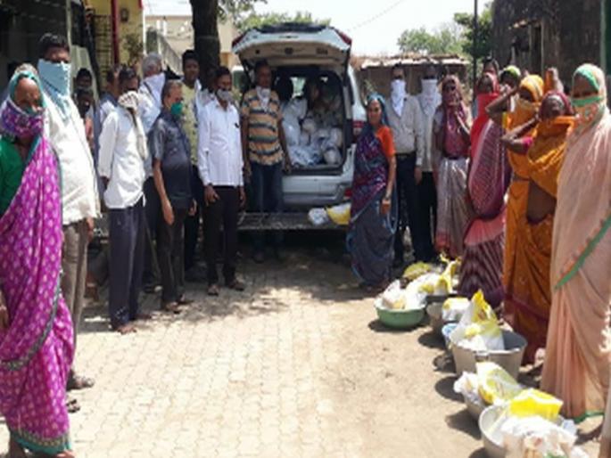 शिंदखेडा : कोरोना संसर्गजन्य आजारामुळे संपूर्ण देशभरात लॉकडाऊन सुरु आहे. यामुळे हातावर पोट असणाऱ्या गोरगरीबांच्या चरितार्थाचा प्रश्न निर्माण झाला आहे. हाताला काम नसल्यामुळे दोन वेळची गुजराण कशी करावी, असा प्रश्न या गरीबांपुढे पडला आहे. अनेकांवर उपासमारीची वेळ आली आहे. या पार्श्वभूमीवर शिंदखेडा येथील कर्नावट परिवाराने वरुळ घुसरे येथे हातमजुरी करणाºया १०० कुटुंबांना किराणा किटचे वाटप केले.कन्हैयालालजी कर्नावट, बाबूलाल कर्नावट, लखीचंद कर्नावट, भुरमल कर्नावट, कल्पेश कर्णावट या सर्वांनी आपल्या वरुळ घुसरे या मूळ गावाचे ऋण फेडावे म्हणून आपल्या जळगावच्या श्री डॉक्टर विल्सन फार्मा या कंपनीच्या माध्यमातून सुमारे १०० गोरगरीब कुटुंबांना एक महिना पुरेल इतका किराणा माल वाटप केला आहे.तर कर्नावट परिवारामधील सदस्य भागचंद कर्नावट, राजमल कर्नावट यांनी तालुक्यात जैन संघटनेच्या ‘डॉक्टर आपल्या दारी’ या फिरत्या उपक्रमांतर्गत सुरु असलेल्या योजनेत मोठा हातभार लावत सुमारे ५० हजार रुपयांची औषधी आपल्या जळगावस्थित विल्सन फार्मा कंपनीच्या माध्यमातून उपलब्ध करून दिली आहे.वरुळ घुसरे या गावात दरवर्षी पाणीटंचाई भासते. त्यामुळे गेल्यावर्षी देखील भीषण पाणीटंचाई असताना भागचंद कर्नावट यांनी गुरांसाठी स्वखर्चातून टँकर उपलब्ध करून देण्याची व्यवस्था केली होती.या किराणा किट वाटपप्रसंगी वरुळ घुसरे ग्रामपंचायतीचे उपसरपंच राकेश गिरासे, माजी सरपंच शिवदास माळी, प्रकाश पाटील, विलास माळी, भटू धनगर, प्रवीण मराठे यांच्यासह ग्रामस्थ उपस्थित होते. गरजूंना किराणा मालाचे वाटप करण्यात आल्याने हतबल झालेल्या नागरिकांना दिलासा मिळाला आहे.लॉकडाऊनमध्ये गोरगरीब गरजूंना मिळाला दिलासाकोरोना संसर्गजन्य आजारामुळे संपूर्ण देशभरात लॉकडाऊन सुरु आहे. यामुळे मोलमजुरी करणाºया कामगारांच्या हाताला काम नसल्याने त्यांच्या कुटुंबावर उपासमारीची वेळ आली आहे. त्यांना आधार देण्यासाठी विविध संस्था, संघटना पुढे येत आहेत. दरम्यान, वरुळ घुसरे येथे कर्नावट परिवाराने १०० गरजू कुटुंबाला महिनाभर पुरेल इतका किराणा माल वाटप केल्याने या कुटुंबाला दिलासा मिळाला आहे.