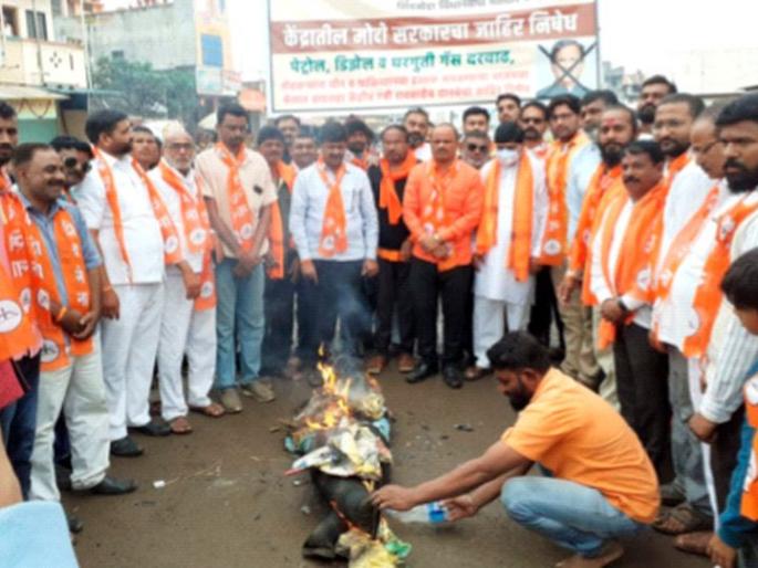 धुळे : पेट्रोल-डिझेल, घरगुती गॅसच्या प्रचंड वाढलेल्या किंमती, त्यामुळे होणारी प्रचंड महागाई तसेच केंद्रातील मोदी सरकारच्या कृषी कायद्याविरोधात शिंदखेडा तालुका शिवसेनेतर्फे केंद्र सरकार विरोधात घोषणाबाजी करत निषेध नोंदवून आंदोलन केले. यावेळी मोटरसायकल-सिलेंडर यांची प्रतिकात्मक मिरवणूक काढली. तसेच केंद्रीय मंत्री रावसाहेब दानवे यांच्या प्रतिकात्मक पुतळ्याला जोडे मारत पुतळा दहन केला.आंतरराष्ट्रीय बाजारात दिवसेंदिवस कच्च्या तेलाचे भाव कमी होत असतांना व कोविडच्या परिस्थितीत सर्वसामान्य शेतकरी, शेतमजुर, कामगार, नोकरदार, व्यापारी यांची आर्थिक परिस्थिती बिकट होत असतांना जिवन कसे जगावे? या विवंचनेत सर्व सामान्य असतांना केंद्रातील मोदी सरकार दिवसेंदिवस पेट्रोल-डिझेल व घरगुती गॅसच्या किंमती भरमसाठ वाढवित आहे.पेट्रोलच्या दराने नव्वदी पार केली आहे. भविष्यात शंभरी पार करेल. डिझेलच्या दराने ऐंशीचा टप्पा गाठला आहे. केंद्राने घरगुती गॅसची सबसिडी रद्द केली असून भाव देखीन दिवसेंदिवस वाढत आहेत. या बाबतीत सर्वसामान्य नागरिकांमध्ये तीव्र संताप असुन केंद्र सरकारने पेट्रोल-डिझेल व घरगुती गॅसच्या किंमती कमी कराव्यात. तसेच शेतकरी विरोधी कायदा रद्द करावा. शेतकऱ्यांना दिलासा देण्याऐवजी केंद्रीय मंत्री रावसाहेब दानवे यांनी शेतकऱ्यांचे आंदोलनात चीन व पाकिस्तानचा हात असल्याचे विधान केले आहे. त्यांची मंत्री पदावरुन हकालपट्टी करावी, अशी मागणी करण्यात आली. यावेळी शिवसेनेचे संपर्कप्रमुख बबनराव थोरात, सहसंपर्कप्रमुख अतुल सोनवणे, धुळे ग्रामीणचे जिल्हाप्रमुख हेमंत साळुंके, जिल्हा संघटक मंगेश पवार, उपजिल्हाप्रमुख शानाभाऊ सोनवणे, तालुकाप्रमुख गिरीश देसले, छोटू पाटील, भाईदास पाटील, डॉ. मनोज पाटील, सर्जेराव पाटील, विनायक पवार, सागर देसले, गणेश परदेशी, प्रदीप पवार, विजय सिसोदे, हिरालाल बोरसे, नंदकिशोर पाटील, विश्वनाथ पाटील, संतोष पाटील, डॉ. भरत राजपुत, डॉ. हितेश वाडीले, विरपाल गिरासे, चेतन राजपुत, शैलेश सोनार, राकाशेठ रुपचंदाणी, दिपक मराठे, नितीन माळी, एस. डी. पाटील, अमृत भामरे, आर. आर. पाटील, एम. एस. जाधव, धनसिंग वसावे, शाम सोनवणे, प्रकाश साळुंके, भटू पाटील, विक्की पाटील, रविंद्र कोळी, सचिन पाटील, गणेश पाटील, सुकदेव बागुल यांच्यासह शिंदखेडा तालुक्यातील पदाधिकारी आणि शिवसैनिक उपस्थित होते.शिरपूरला गाडी लोटो आंदोलनाने वेधले लक्षधुळे : लॉकडाऊन लागू झाल्यापासून सातत्याने पेट्रोल-डिझेलची दरवाढ केली जात असल्याचा आरोप करीत शिवसेनेने शनिवारी गाडी लोटो आंदोलन केले. यावेळी दरवाढ मागे घेण्याच्या मागणीसोबतच केंद्र सरकारच्या निषेधाच्या घोषणा देण्यात आल्या. पाच कंदिल चौकात 