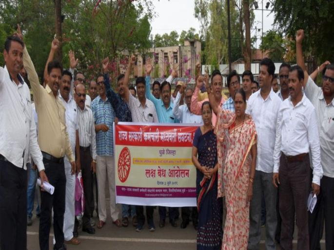 आॅनलाइन लोकमतधुळे : जुनी पेंशन योजना लागू करावी, सर्व संवर्गातील रिक्त पदे त्वरित भरण्यात यावी यासह विविध मागण्यांकडे लक्ष वेधण्यासाठी राज्य सरकारी कर्मचारी मध्यवर्ती संघटनेतर्फे बुधवारी लक्षवेधी दिवस पाळून भोजन काळात क्युमाईन क्लबसमोर निदर्शने करण्यात आली. जिल्हा प्रशासनामार्फत मुख्यमंत्री देवेंद्र फडणवीस यांना निवेदन पाठवले.दिलेल्या निवेदनात म्हटले आहे की, आॅगस्ट २०१८मध्ये केलेल्या तीन दिवसीय आंदोलनाच्या पार्श्वभूमिवर १ जानेवारी १६ पासून राज्य सरकारी कर्मचाऱ्यांना सातवा वेतन आयोग लागू करण्यात आला. त्यावेळी झालेल्या चर्चे दरम्यान प्रलंबित मागण्या लवकरात लवकर मान्य करण्याचे आश्वासन दिले होते. त्या अद्याप मंजूर न झाल्याने, राज्य सरकारी कर्मचाºयांनी शासनाचे लक्ष वेधण्यासाठी ३ जुलै रोजी लक्षवेधी दिवस पाळून निर्दशने केली. दरम्यान राज्य शासनाने कर्मचाºयांच्या मागण्यांचा सकारात्मक विचार करावा. या मागण्यांकडे दुर्लक्ष झाल्यास राज्यातील १९ लाख सरकारी, निमसरकारी, शिक्षक, शिक्षकेतर कर्मचारी २० आॅगस्ट १९ रोजी एक दिवसाचा राज्यव्यापी संप करतील असा इशारा देण्यात आला.याप्रसंगीत संघटनेचे प्रदेश उपाध्यक्ष डॉ. संजय पाटील, कार्यकारी अध्यक्ष अशोक चौधरी, चतुर्थ श्रेणी कर्मचारी मध्यवर्ती संघटनेचे एस.यू.तायडे, वाल्मीक चव्हाण, जिल्हा परिषद महासंघाचे प्रदेश उपाध्यक्ष उज्वल भामरे, कल्पेश माळी, माध्यमिक शिक्षक संघटनेचे जे.बी. सोनवणे, सुनील पवार, देवेंद्र ठाकूर, प्रा. बी.ए.पाटील, शशांक रंधे, ज्ञानेश्वर बाविस्कर यांच्यासह अनेकजण उपस्थित होते.