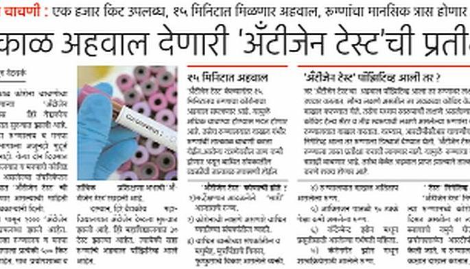 लोकमत न्यूज नेटवर्कधुळे : तात्काळ कोरोनाचा अहवाल देणारी अँटिजन टेस्ट ची येथील जिल्हा रूग्णालयात सुरूवात करण्यात आली. अँटिजेन टेस्टमुळे १५ मिनिटांत कोरोनाचा अहवाल मिळणे शक्य होणार आहे.अँटिजेन टेस्टचे किट प्राप्त होऊनही चाचण्यांना प्रारंभ झाला नव्हता. याबाबत लोकमतने, तात्काळ अहवाल देणारी अँटिजेन टेस्टची प्रतीक्षा या मथळ्याखाली वृत्त प्रकाशित केले होते. त्यानंतर जिल्हा रूग्णालयात अँटिजेन टेस्टला प्रारंभ झाला आहे. मंगळवारी ५० रूग्णांची अँटिजेन टेस्ट करण्यात आली. त्यापैकी चार रूग्णांचे अहवाल पॉझिटिव्ह आले तर ४६ रूग्णांचे अहवाल निगेटीव्ह आले आहेत. गेल्या तीन ते चार महिन्यांपासून कोरोना या विषाणूजन्य आजाराने धुमाकूळ घातलेला आहे़ अनलॉकच्या टप्प्यात तर या महामारीने कहर माजविला आहे़ दररोज शंभराहून अधिक रुग्ण पॉझिटिव्ह आढळून येत आहेत़ मृतांच्या आकडेवारीने देखील शंभरी गाठली आहे़ कोरोना बाधितांचा आकडा दोन हजारावर कधीच गेलेला आहे़ हिरे वैद्यकीय महाविद्यालय कोरोनाग्रस्त रुग्णांनी फुल्ल झाले आहे़ स्वॅब घेतल्यानंतर संबंधितांना दोन ते तीन दिवस अहवालाची वाट पहावी लागत होती़ त्यामुळे बाधितांच्या संपर्कातील लोकांचा जीव देखील टांगणीला लागायचा़ आता मात्र तसे होणार नाही, असे चित्र सद्या दिसून येत आहे़७ जुलै पासून १००० ‘अँटीजेन टेस्ट’किट उपलब्ध झाले आहेत. त्यापैकी जिल्हा रुग्णालय व मनपा आरोग्य विभागाला प्रत्येकी ५०० किट प्राप्त झाले आहेत. मात्र प्रयोगशाळा व तांत्रिक प्रशिक्षणा अभावी ‘अँटीजेन टेस्ट’रखडली होती़ आता असे होणार नाही़धुळ्यात कोरोना निदानाच्या अँटिजेन चाचणीला मंगळवारपासून सुरुवात झाली आहे़ डॉ़ विशाल पाटील हे अँटिजेन चाचणी घेत आहेत़