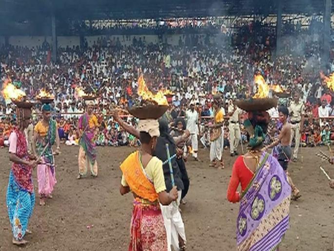 पिंपळनेर : सदगुरू श्री खंडोजी महाराज यांची १९१ वी पुण्यतिथी व नामसप्ताह महोत्सव निमित्ताने सोमवार ९ सप्टेंबर रोजी येथील खंडोजी महाराज क्रीडा संकुलावर भव्य आदिवासी पारंपरिक नृत्य स्पर्धेचे आयोजन करण्यात आले होते. या नृत्य स्पर्धेत होळी नृत्य सादर करणाºया नर्मदानगर, तळोदा संघाने प्रथम क्रमांक पटकावला. या संघाला २१ हजारांचे बक्षिस प्रदान करण्यात आले. या नृत्य स्पर्धेत धुळे, नंदुरबार, नाशिक या जिल्ह्यांसह गुजरात राज्यातून एकूण १८ संघांनी सहभाग घेतला होता. स्पर्धेचे उदघाटन हभप योगेश्वर महाराज देशपांडे यांच्या हस्ते झाले. यावेळी अॅड.संभाजीराव पगारे, सरपंच साहेबराव देशमुख, मोहन सूर्यवंशी, तुळशीराम गावित, डॉ. जितेश चौरे, मंजुळा गावित, हभप सर्वेश्वरदास महाराज, सहाय्यक पोलीस निरीक्षक पंजाबराव राठोड, उपनिरीक्षक लोकेश पवार, भूषण हंडोरे, प्रताप पाटील, उपसरपंच संजय जगताप, तुकाराम बहीरम, कैलास सूर्यवंशी, सचिन धामणे, रवींद्र कोतकर, गणेश कोतकर, नितीन कोतकर, रत्नाकर बाविस्कर, उल्हास बागुल आदी समितीचे पदाधिकारी व कार्यकर्ते उपस्थित होते. यावेळी धुळे, नंदुरबार व गुजरात राज्यातील विविध ठिकाणांहून आलेल्या विविध १८ संघांनी स्पर्धेत पारंपरिक नृत्यांनी चांगलाच रंग भरला. या संघांनी आदिवासी नृत्यांसह वाद्य वाजवत उपस्थित हजारो श्रोत्यांचा आनंद द्विगुणित केला. यावेळी त्यांना बक्षिसांसह देणगी देण्यात आली. उपस्थित नागरिकांना विविध आदिवासी नृत्यकला प्रत्यक्ष पाहण्याचा, अनुभवण्याचा आनंद लुटला. यात नंदी नृत्य, टिपरी नृत्य, पारंपारिक नृत्य सादर करण्यात आले यावेळी होळी नृत्य सादर करणाºया नर्मदा नगर, तळोदा संघाला प्रथम क्रमांक मिळाला. त्यांना २१ हजार रुपये, प्रमाणपत्र व सन्मानचिन्ह प्रदान करून गौरव करण्यात आला. द्वितीय क्रमांक ठाकूर नृत्य सादर करणाºया सुरगाणा संघाला ११ हजार रुपये मानपत्र व सन्मानचिन्ह देऊन गौरवण्यात आले. तृतीय क्रमांक डांगी नृत्य सादर करणाºया धवलीदोंड संघाला सात हजार रुपये मानपत्र सन्मानचिन्ह देऊन गौरविण्यात आले. उत्तेजनार्थ टिपरी नृत्य भोयाचापाडा पाच हजार रुपये प्रमाणपत्र स्मृतिचिन्ह, नंदी नृत्य जैतापूर सटाणा तीन हजार रुपये प्रमाणपत्र व स्मृतिचिन्ह, भोंगºया नृत्य, कोठबांधणी एक हजार रुपये प्रमाणपत्र स्मृतिचिन्ह देऊन मान्यवरांच्या हस्ते गौरवण्यात आले, कार्यक्रमाचे सूत्रसंचालन सुभाष महाजन यांनी केले.स्पर्धेचे काटेकोर परीक्षण या भव्य स्पर्धेचे परीक्षण विजय खैरनार, रोहिदास कोकणी, डॉ.जी.एस. ठाकरे यांनी अत्यंत काटेकोरपणे केले. बक्षिसांचे प्रायोजक हे उपस्थित मान्यवर हे होते. या स्पर्धा यशस्वी करण्यासाठी डॉ.मिलिंद कोतकर, देवेंद्र पाटील, योग